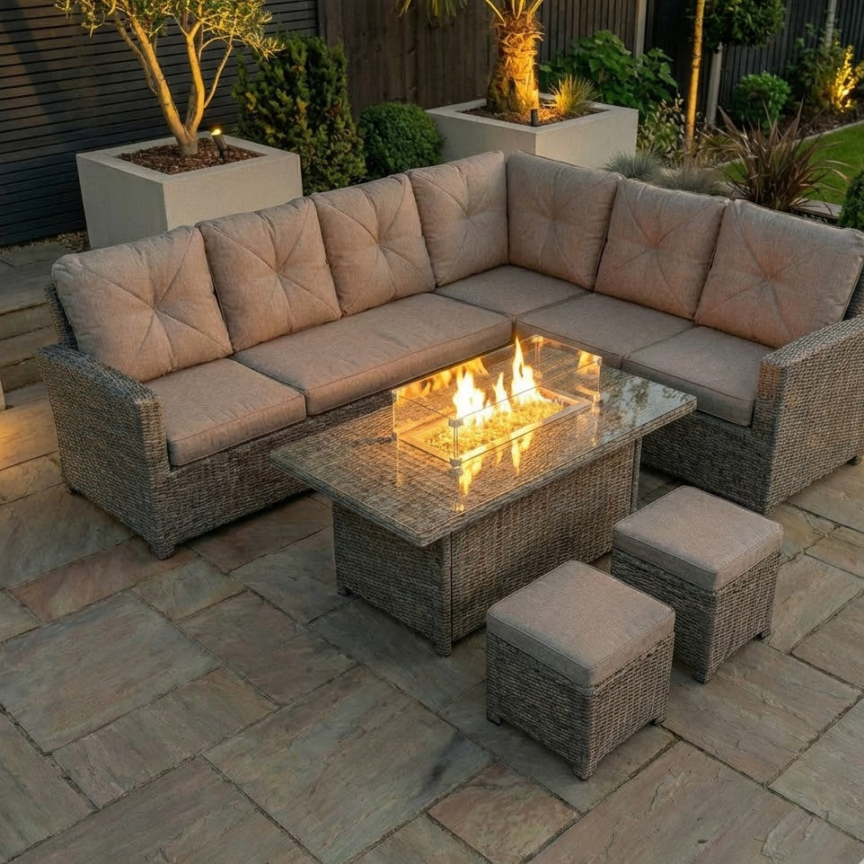 The generously proportioned L-shaped seating invites conversation, while the integrated fire pit table becomes a natural focal point as daylight fades — offering ambient warmth and a refined glow without compromising on style.