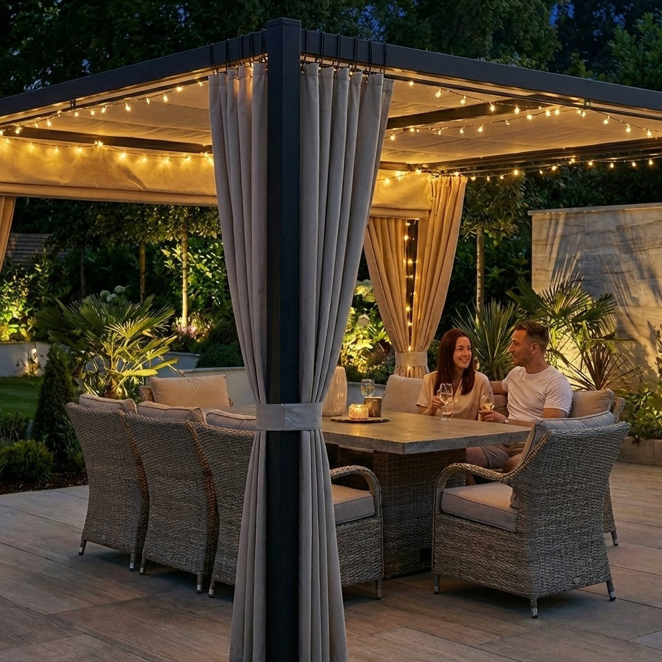 The retractable canopy allows you to control light and shade throughout the day, while full-length curtains add privacy, wind protection, and a premium finish — transforming your outdoor space into a true extension of your home.
